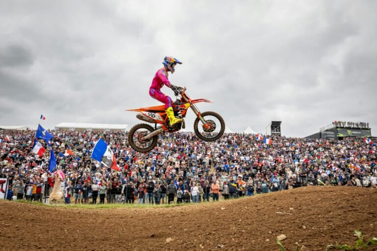 Ernée, France – In a gripping MX2 Qualifying Race at the historic Ernée circuit, Andrea Adamo (KTM) secured victory with a time of 24:13.701, edging out Simon Laengenfelder (KTM) by 2.770 seconds. Sacha Coenen (KTM) rounded out the podium, finishing third, 8.891 seconds off the winner.