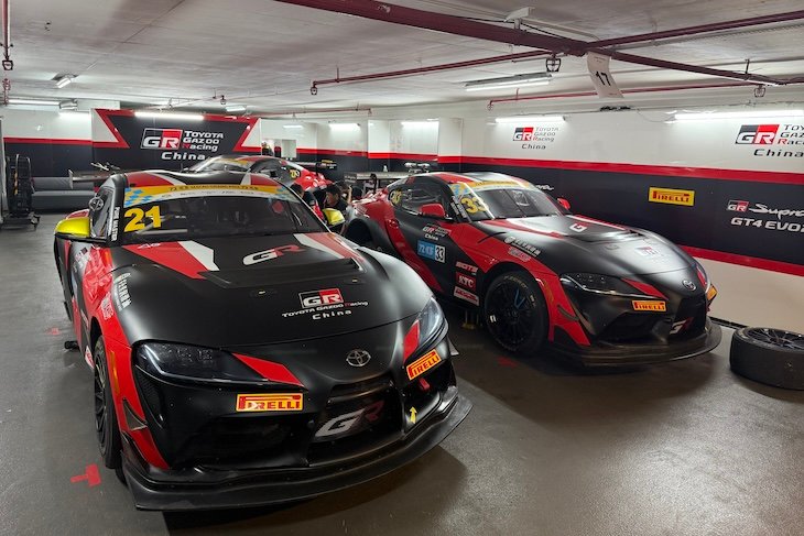 The GT3 entries are stationed in paddock garages, while the GT4s are located in an underground car park, alongside the Toyota GR86 and Subaru BRZ competing in the Roadsports Challenge. The event also includes TCR Touring Cars, Formula Regional, F4 single-seaters, and a range of motorcycles, ensuring continuous on-track action throughout the weekend.