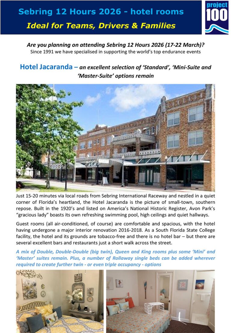 As anticipation builds for the 2026 Sebring 12 Hours, Project 100 has released an updated list of remaining hotel accommodations in the vicinity. As one of motorsport’s most storied endurance races, the event draws significant attendance from teams, fans, and stakeholders alike.