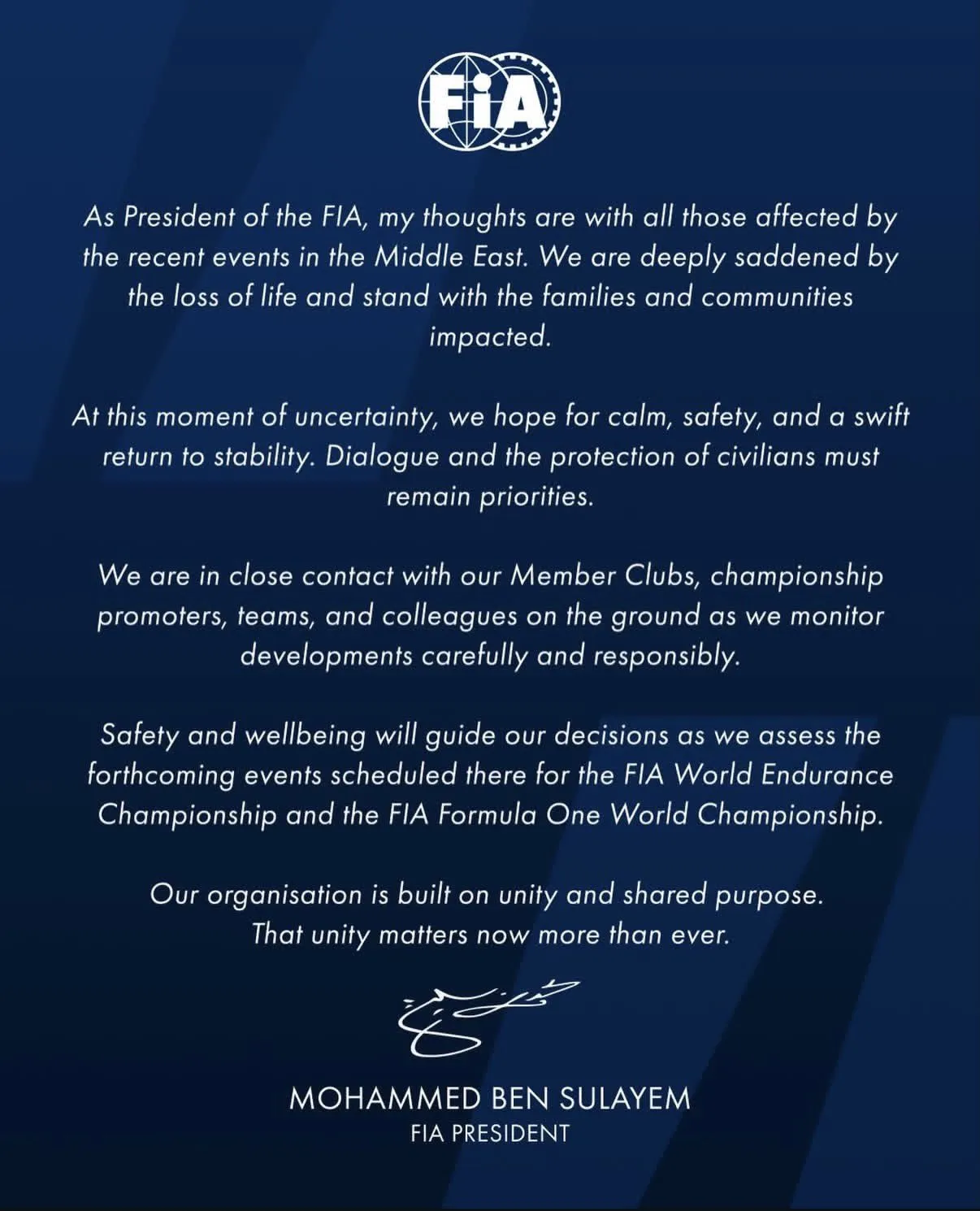 FIA President Mohammed Ben Sulayem addressed the situation, emphasizing the paramount importance of safety as decisions regarding the future of the Qatar race and other upcoming events—such as the F1 Grand Prix in Bahrain and Saudi Arabia—are deliberated.